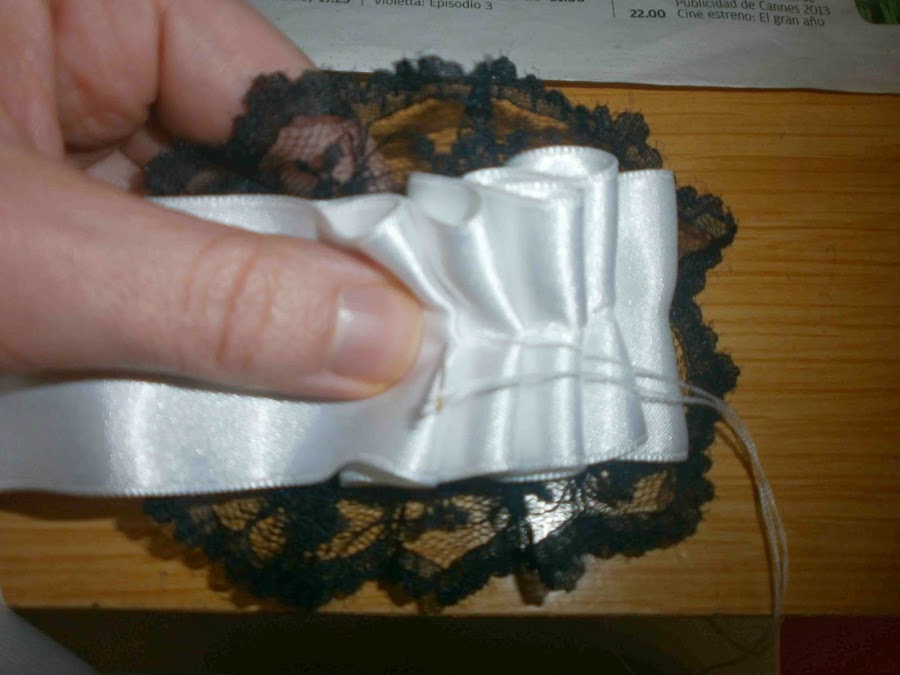 Luego hacemos unas pequeñas dobleces con el lazo y cosiendo cada doblez con el hilo blanco por el medio.