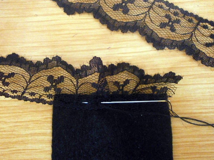 Primero cosemos la puntilla alrededor del trozo del fieltro con hilo negro.