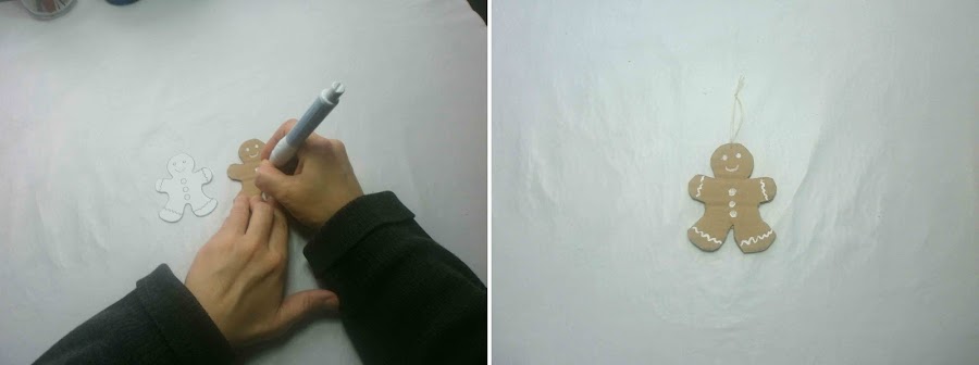 Guíate por las plantillas para dibujar las galletas con el rotulador corrector. Si quieres puedes hacer tus propios dibujos. Finalmente pasa una aguja con hilo y haz un nudo para poder colgarlo en el árbol de Navidad.