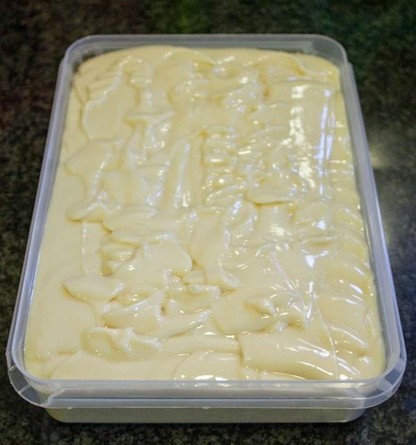 Cuando lleguéis a la consistencia de crema, hay que verter el jabón en un recipiente. En este caso, yo usé un táper viejo, pero podéis hacer un molde con un tetrabrick de leche abierto por un lado y bien limpio, por ejemplo.