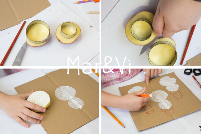 Primero lavamos bien la patata y la cortamos a la mitad, la secamos con un poco de papel de cocina, y con dos cortantes para galletas redondos hicimos presión sobre las mitades. Con un cuchillo eliminamos todo el borde externo, y ya tenemos listo el sello.