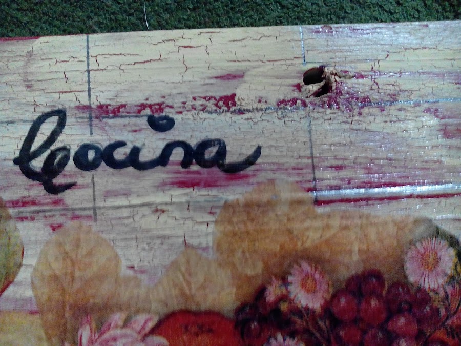 Pinté la base color rojo y sobre esta un craquelado en color crema. Cuando este seco entonces procedí al decoupage con una servilleta que encontré tiene un diseño apropiado a lo que buscaba.