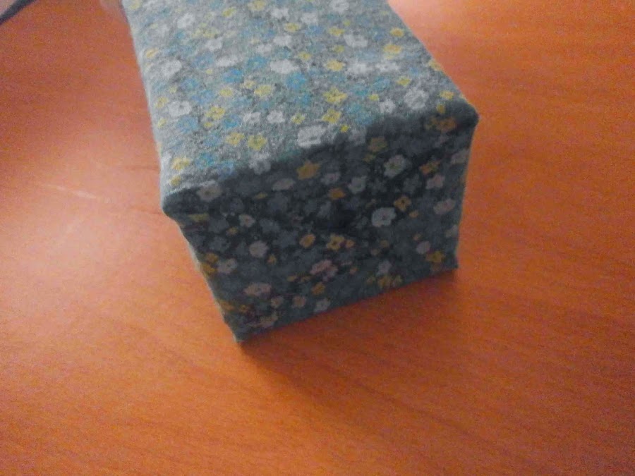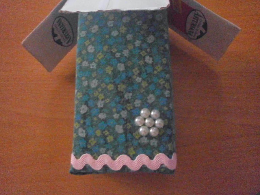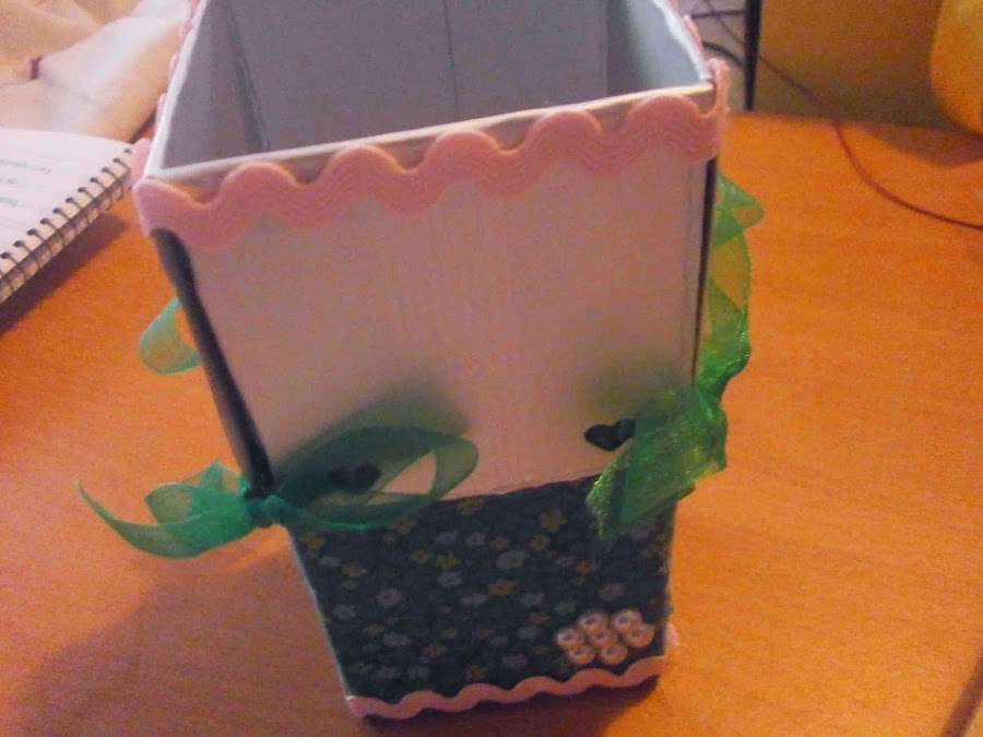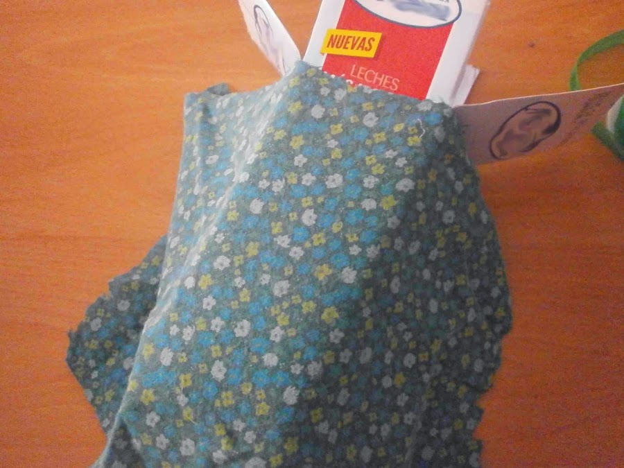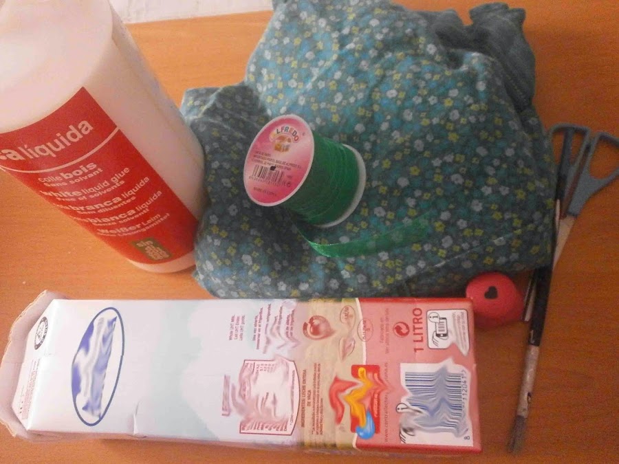 Materiales principales: un cartón de leche vacío, tela, cola blanca, pincel, lazo, tijeras, troqueladora, tripa de pollo, abalorios, silicona, una regla y un lapiz.
