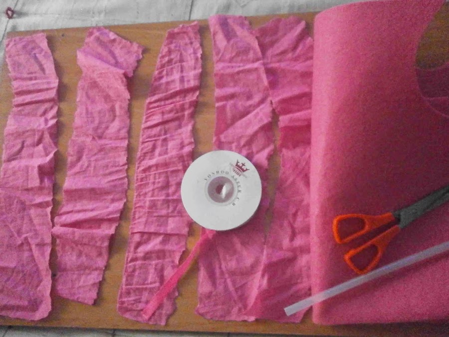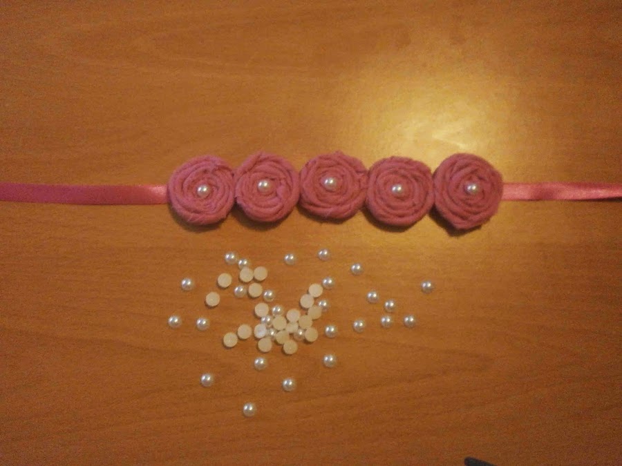 Materiales: Tela ( 5 tiras de tela de unos 35 cm de largo por 7 cm de ancho), fieltro, silicona, tijeras, lazo, perlitas.