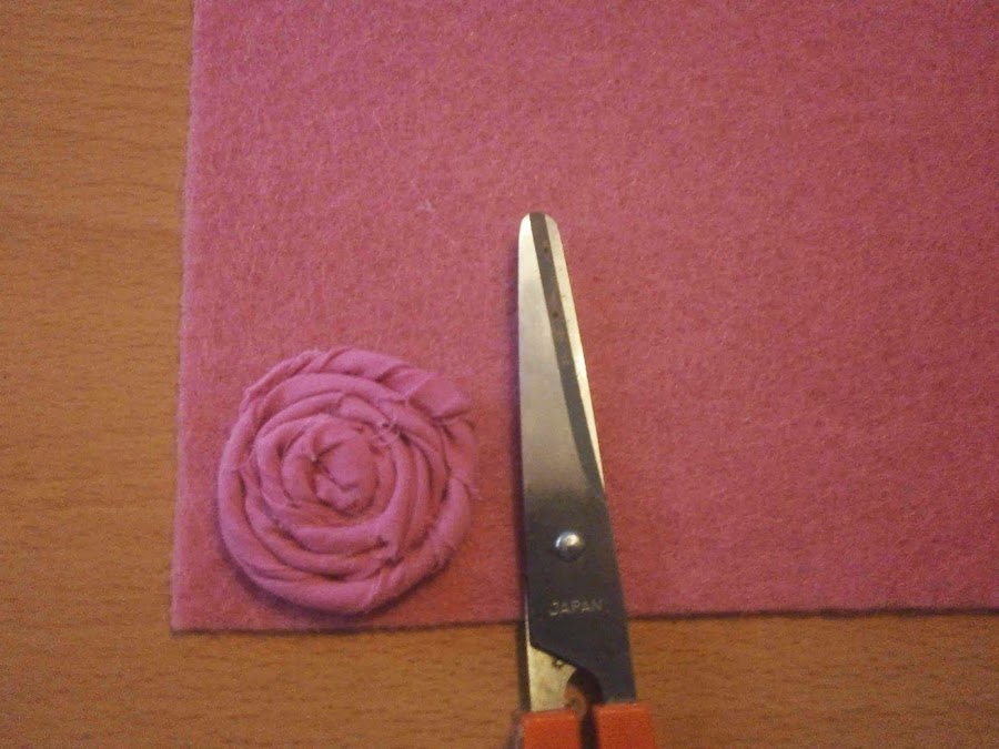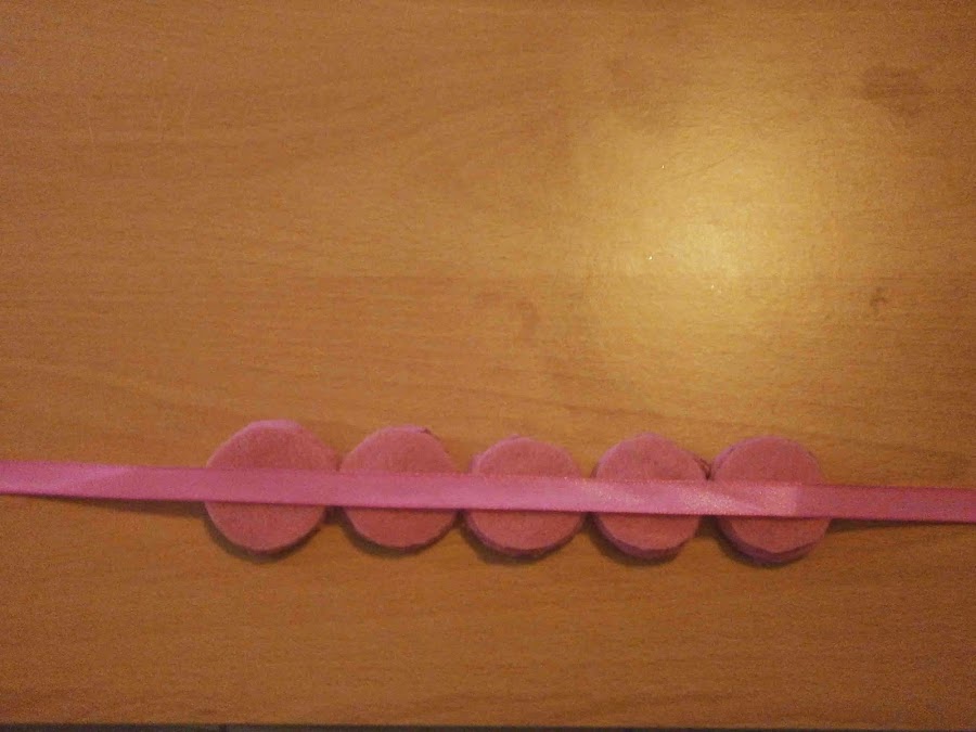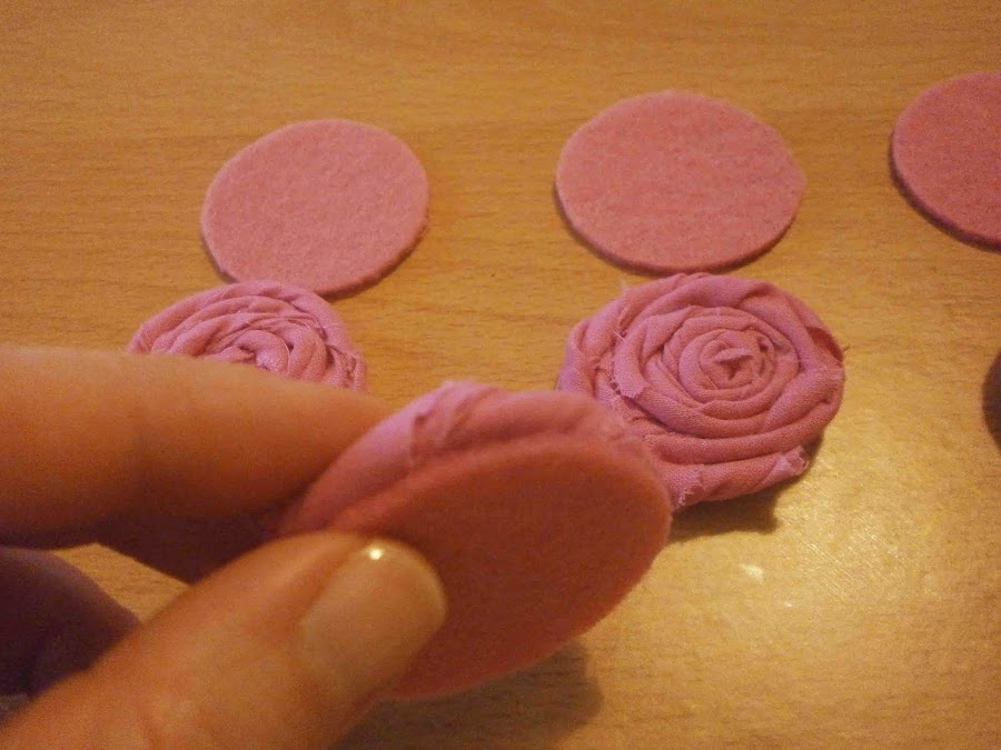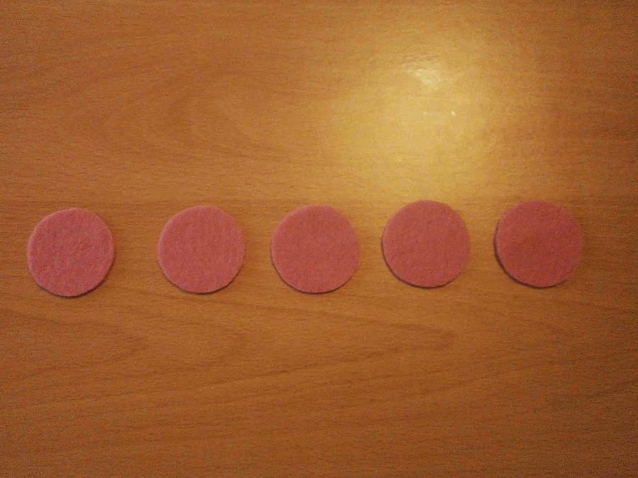 Corte 5 círculos de fieltro poniendo una flor encima y recortando alrededor, para que tuviera la misma medida que la flor.