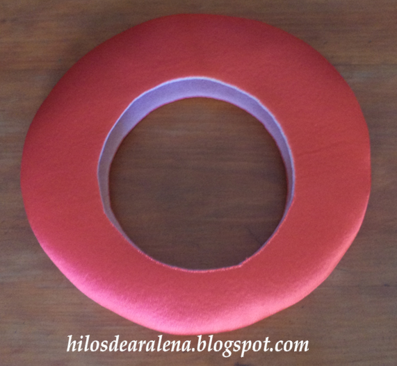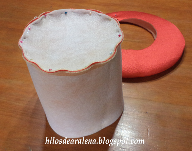 Por otro lado , cerramos el rectángulo y colocamos la tapa al cilindro . En este caso el rectángulo es de 58 cm ( la medida interna del hueco del ala ), por 20 cm de alto. Si les resulta mas cómodo para trabajar, primero hilvanen o sujeten con alfileres.