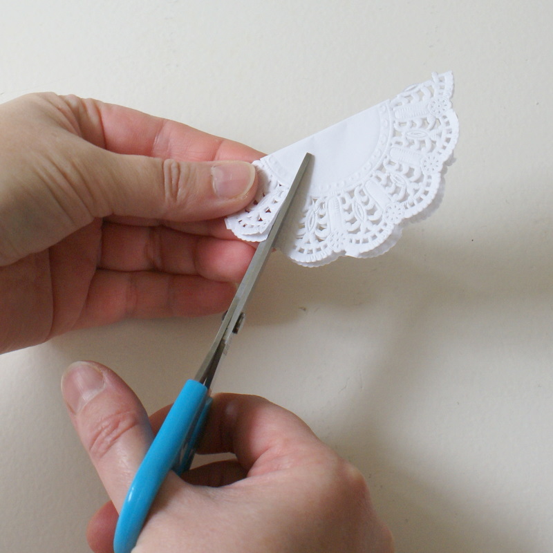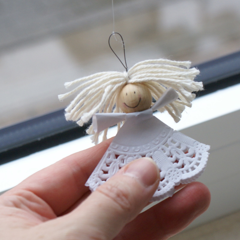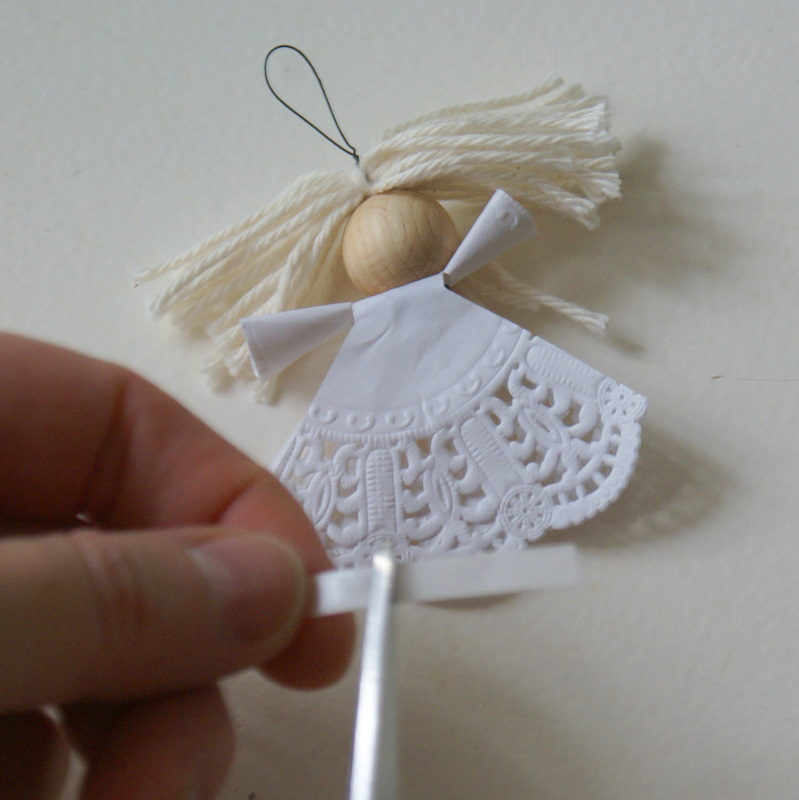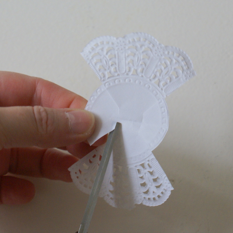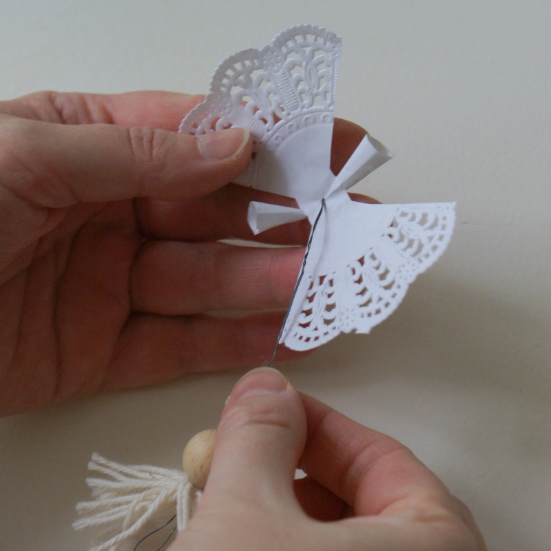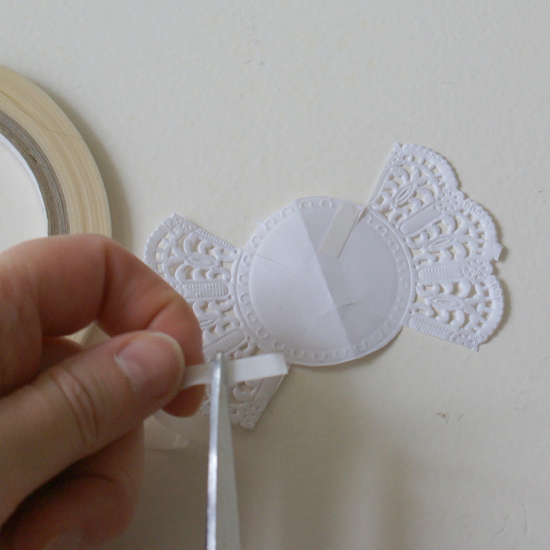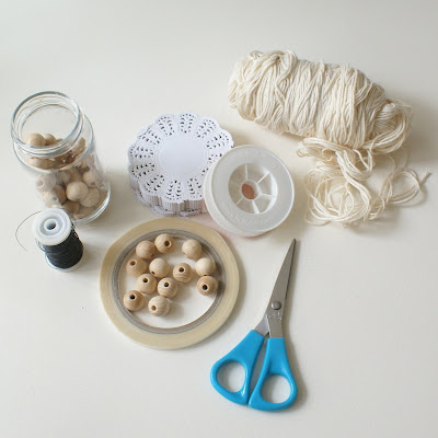 Esto es lo que necesita: servilletas de papel (blonda de tartas) bola de madera, hilo de algodón, hilo de metal fino, tijeras, cinta adhesiva de doble cara y el hilo de nylón.