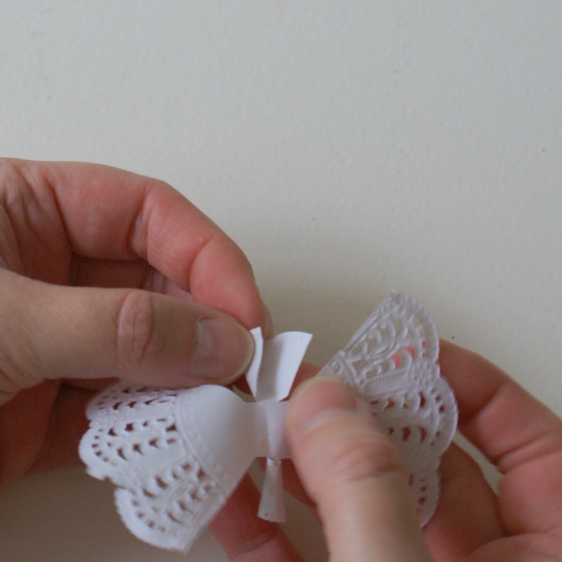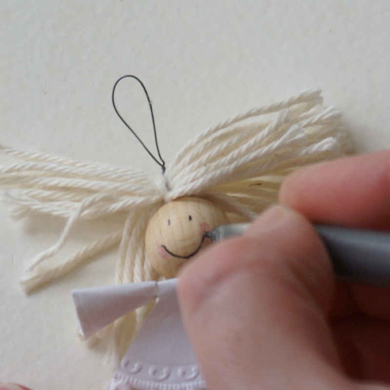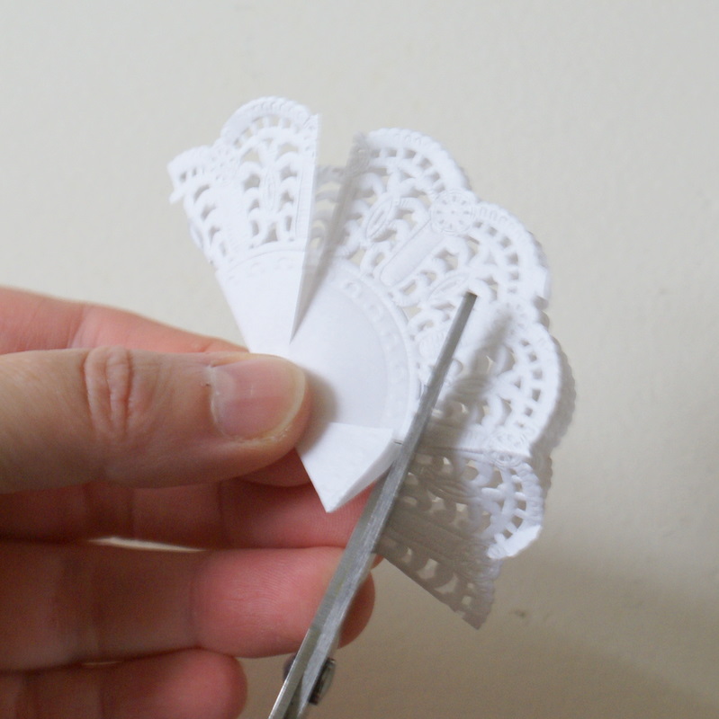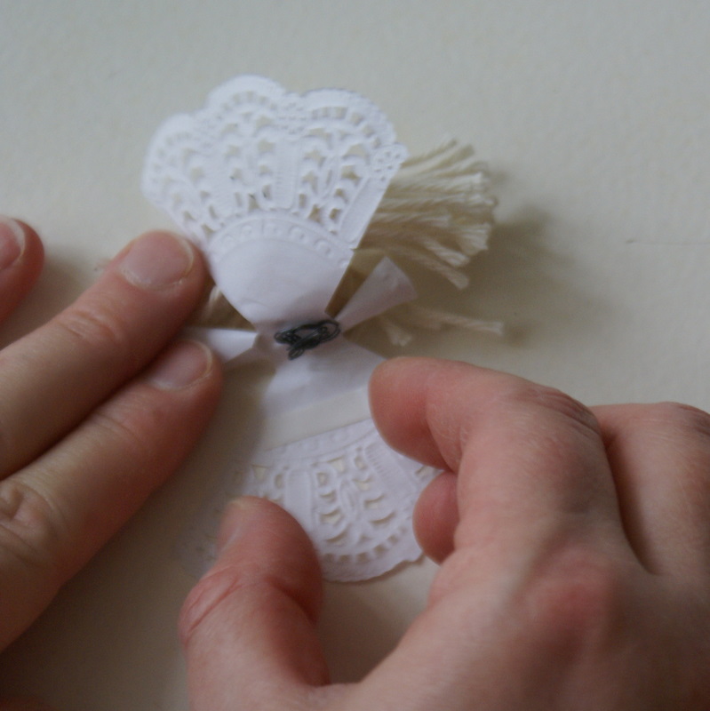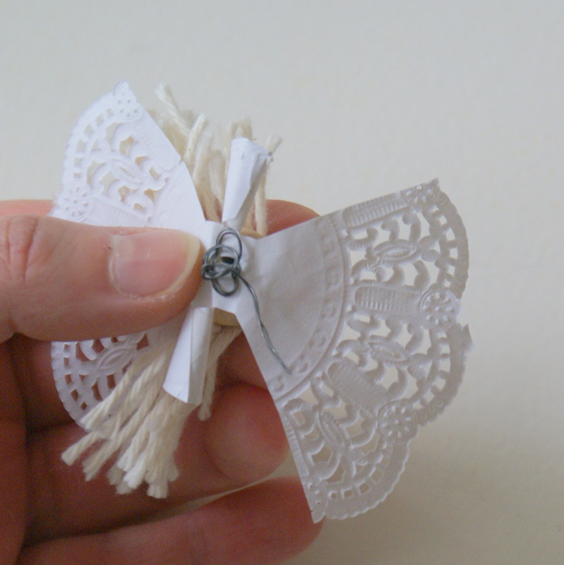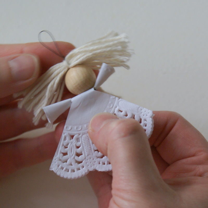 Esto es lo que necesita: servilletas de papel (blonda de tartas) bola de madera, hilo de algodón, hilo de metal fino, tijeras, cinta adhesiva de doble cara y el hilo de nylón.