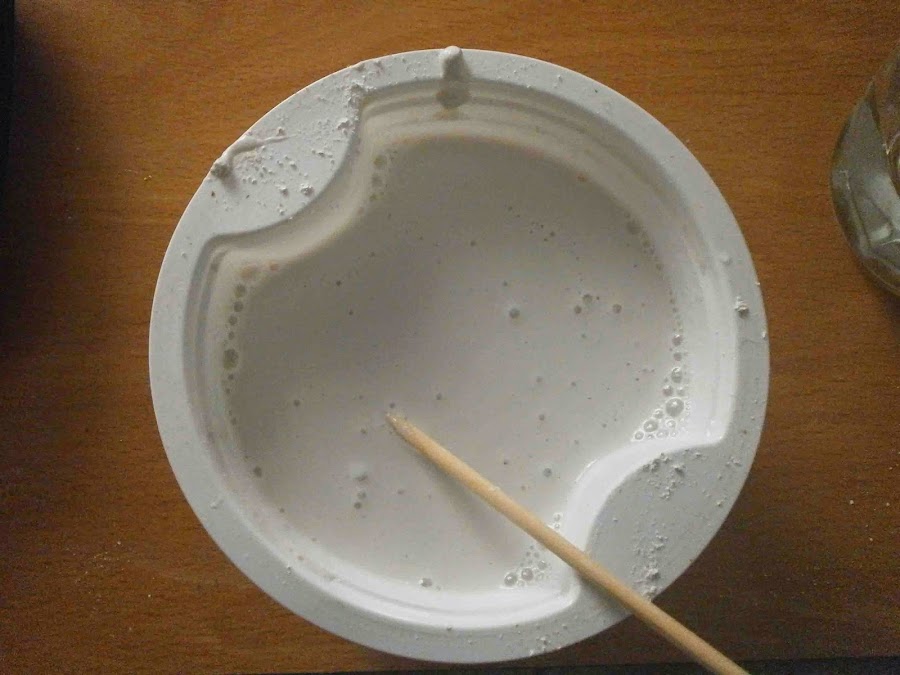 Yeso, un recipiente de plástico, un palo de madera y una aguja.