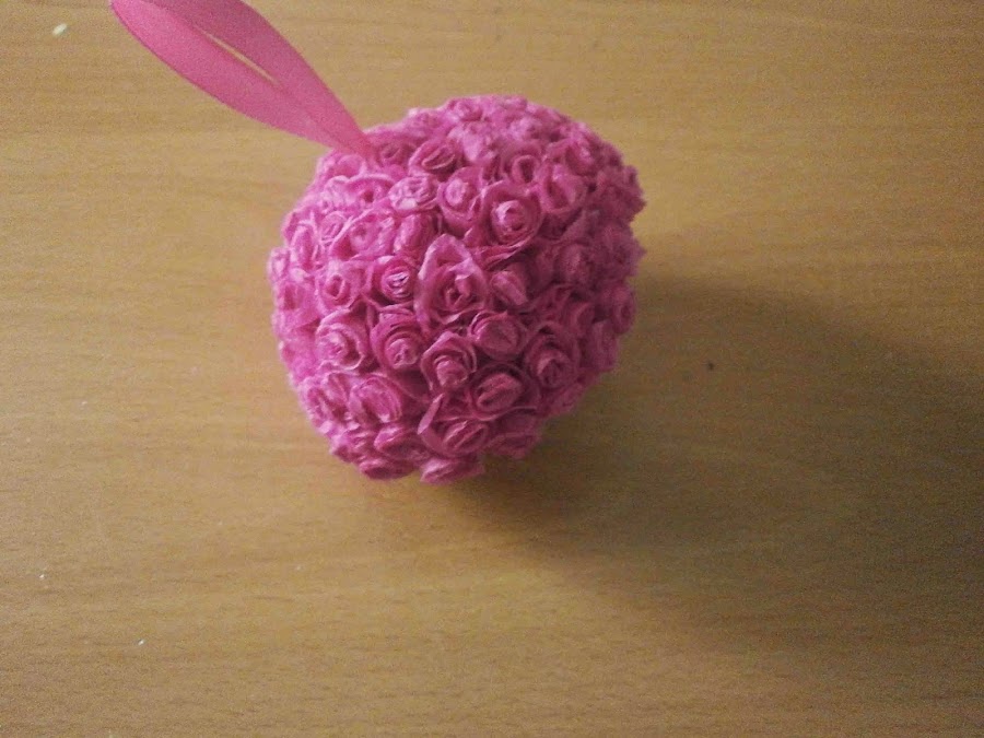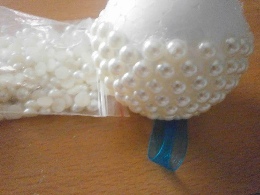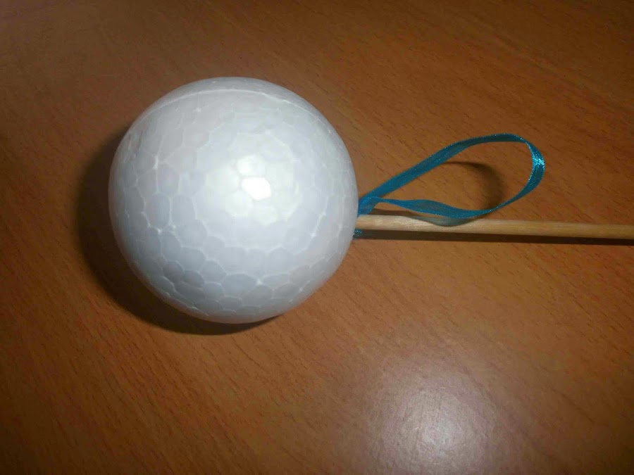Con la ayuda de un palito de madera con punta le hice un agujero a la bola, introduje el lazo asegurándolo con silicona para que no se saliera.