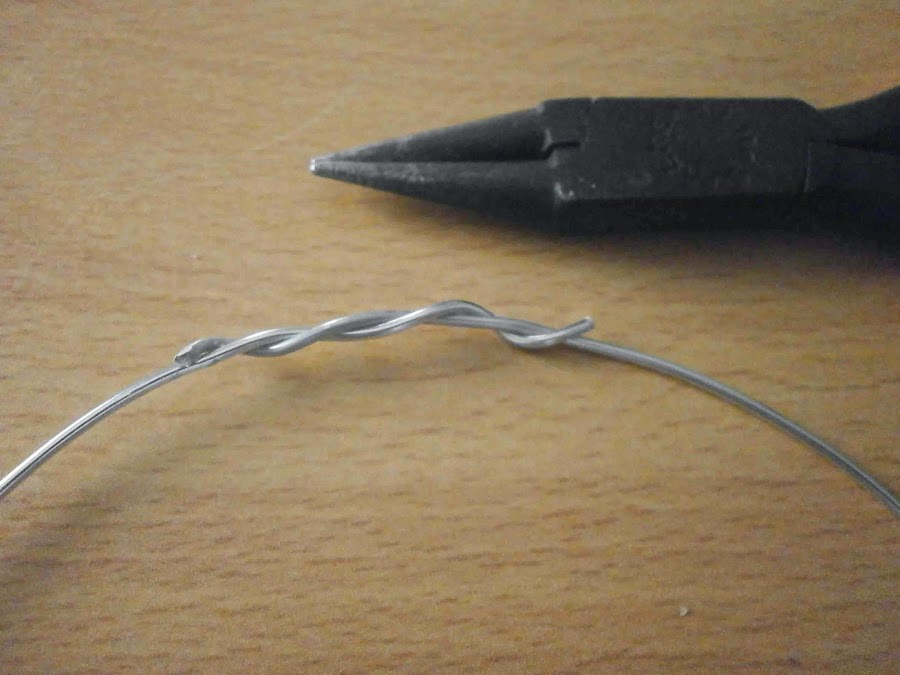 Doble el alambre azul un poquito y enrosque también las puntas con las tenazas.