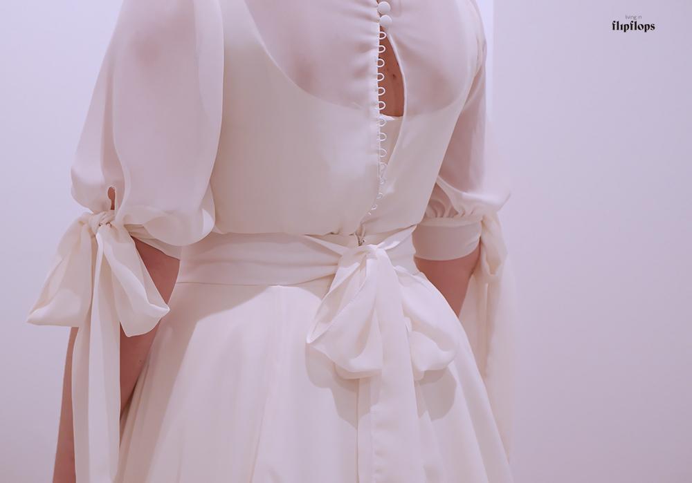 Una vez cosida la glasilla, llega el momento de probártela o probársela a la persona para quien estás cosiendo. Está prueba es muy importante, ya que es en este momento cuando vas a comprobar como queda tu diseño y vas a tomar nota de todas la rectificaciones que debes hacer en tu patrón. Estrechar la cintura, acortar el bajo, subir la sisa… en fín cualquier cosa, toma nota y no tengas miedo de escribir, pintar, cortar sobre tu glasilla. Es tu utensilio de trabajo, sirvete de él.Por ejemplo si te fijas en el dibujo y la foto del principio del post, el dibujo muestra un escote en cuello barco, y en la foto final el vestido tiene un escote mucho más abierto, y esto es simplemente que en la primera prueba ví que respecto a la morfología de mi clienta sentíamos la necesidad de agrandar ese escote.