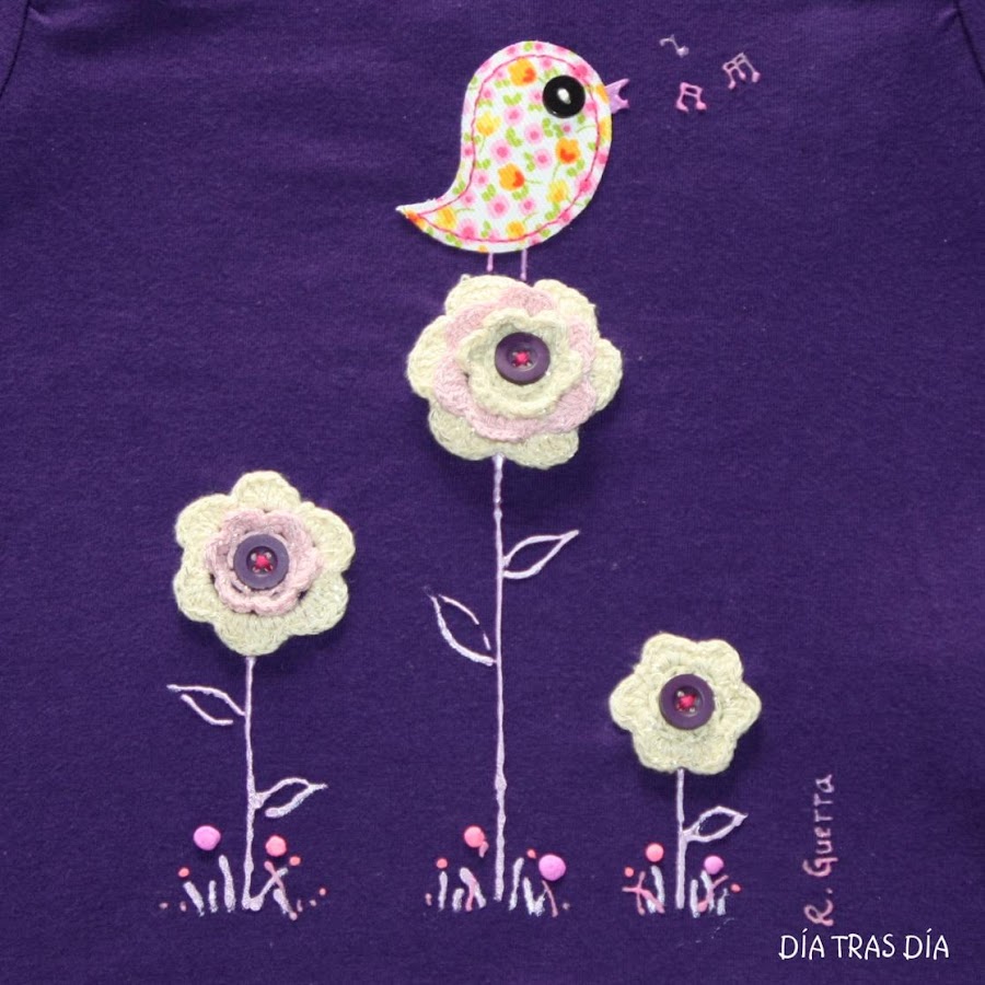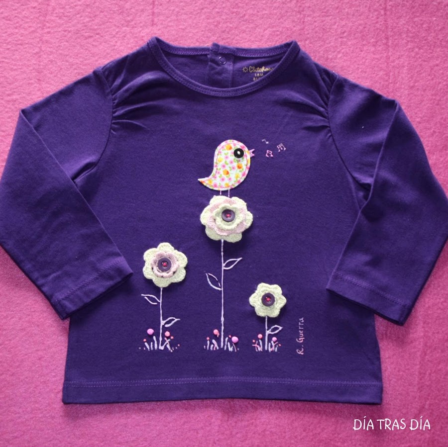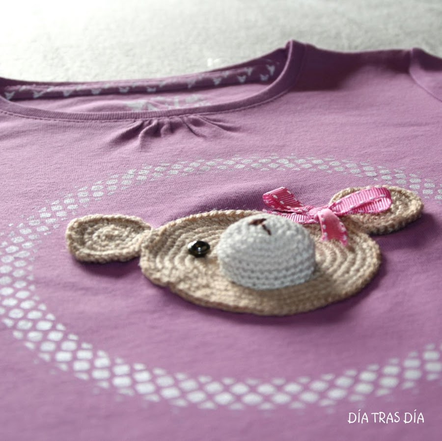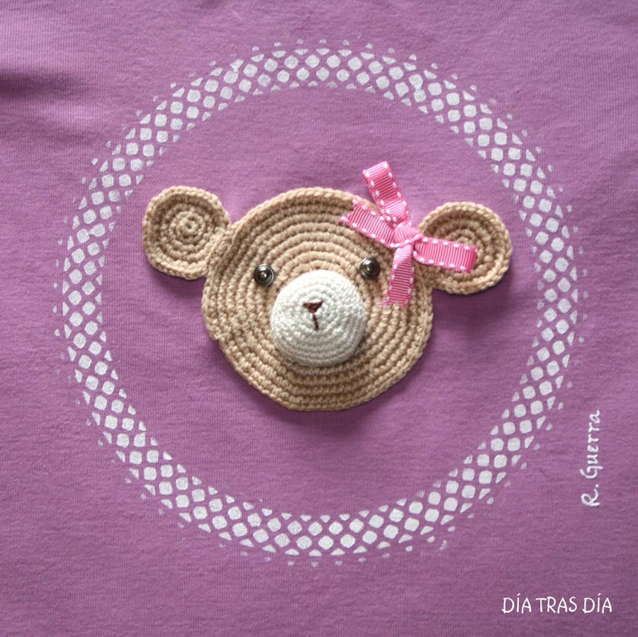 ¿Os han gustado? Este último modelo es el primero que he hecho y aún no lo había enseñado aquí, así que ahora es un buen momento. Después de haber hecho la camiseta modelo "Corazón perdido" con la técnica del estarcido, decidí probar con otro aplique distinto dentro del círculo y se me vino de pronto esta imagen a la mente y así fue como salió "Osita con lazo". Yo creo que ha quedado muy simpática, ¿no os parece?
