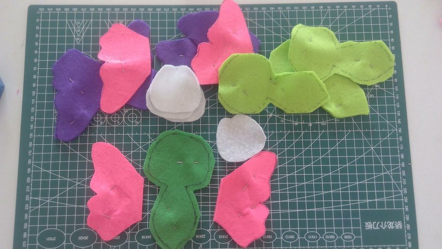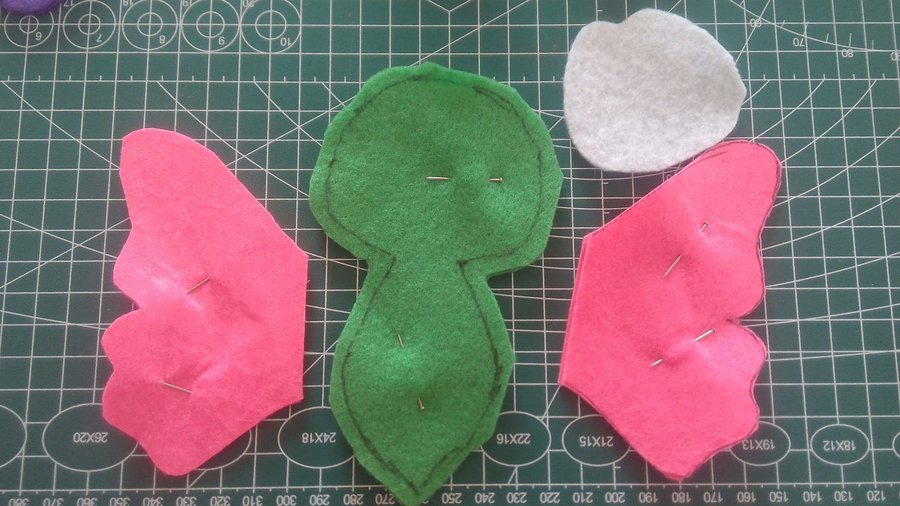 Dibujamos cuatro alas, dos cuerpos y la nariz. Las alas las he cortado poniendo el fieltro doble para que me salieran las dos partes exactamente iguales y el cuerpo también.