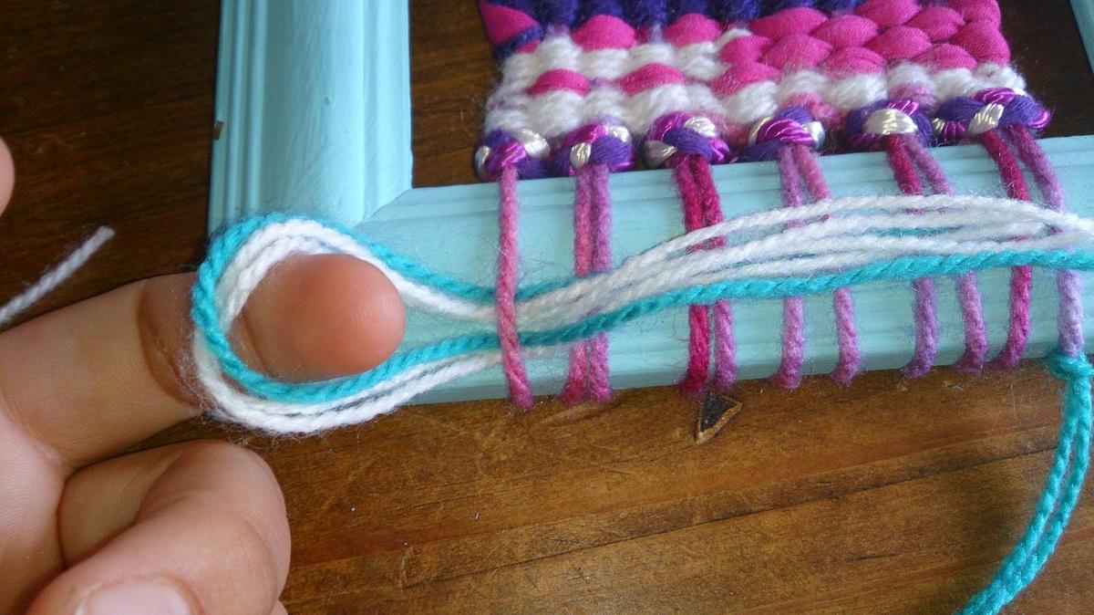 3º Ahora vamos pasando el hilo que nos guste, en zig zag, es decir uno por delante y otro cruzado por detrás.