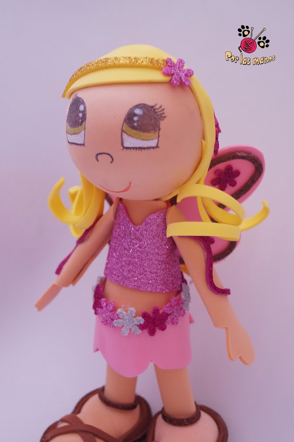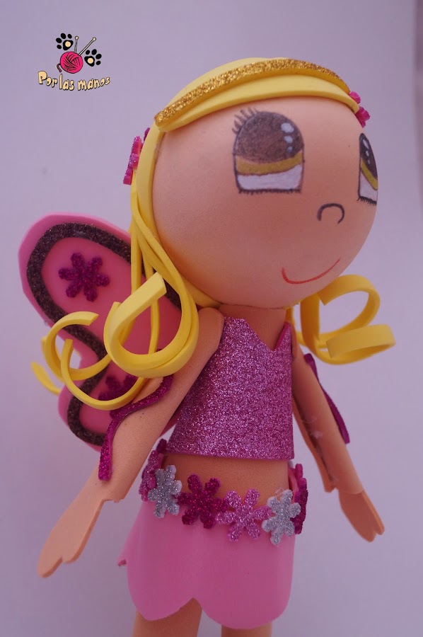 Hacía tiempo que empecé a hacer esta fofucha, pero hace ya como un par de meses, y por fin hoy la he terminado! Ha salido de imaginación. Tenía unas ganas de usar la goma eva de purpurina que pensé...¿por qué no hacer una hada? jajajaja ¿Qué os parece? :)
