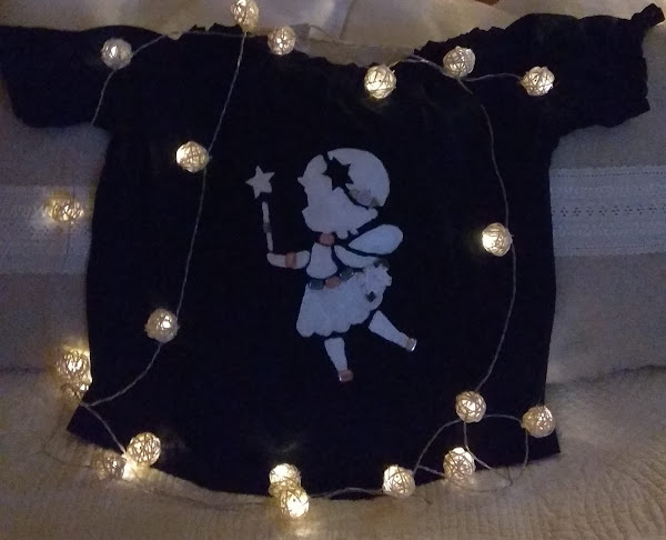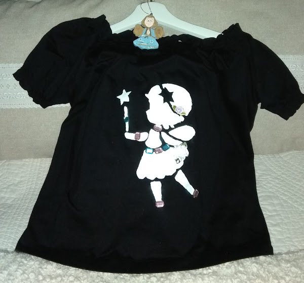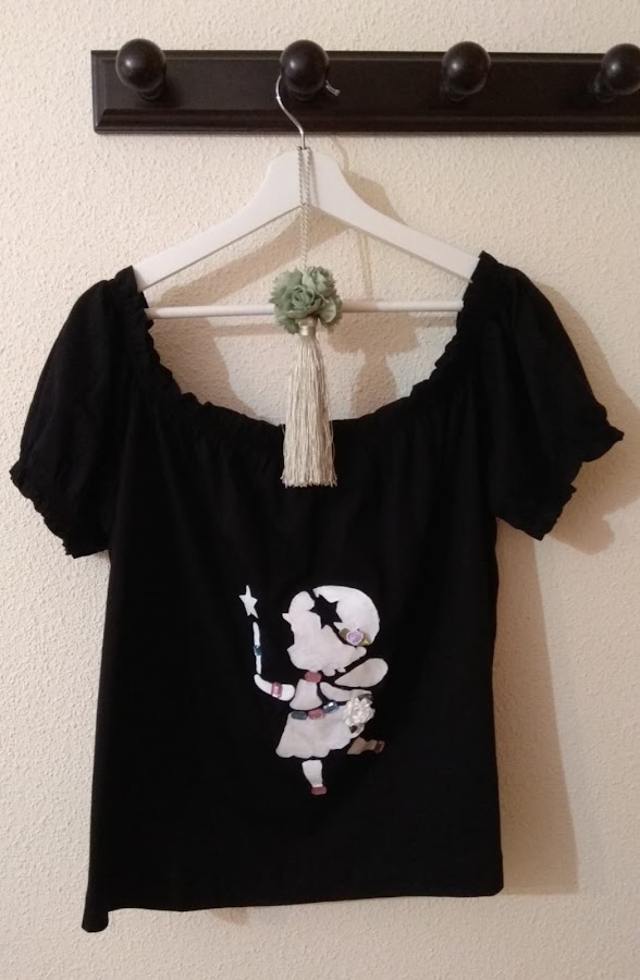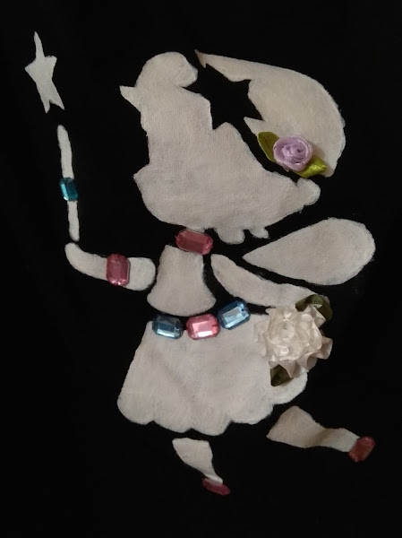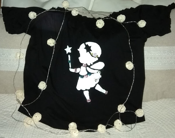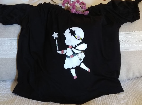Me ha venido de perlas el tema escogido por nuestra anfitriona, para dar otro aire mas simpático a mi camiseta, haciendo un estarcido de una hadita y decorándola con flores de tela y piedrecitas de colores.