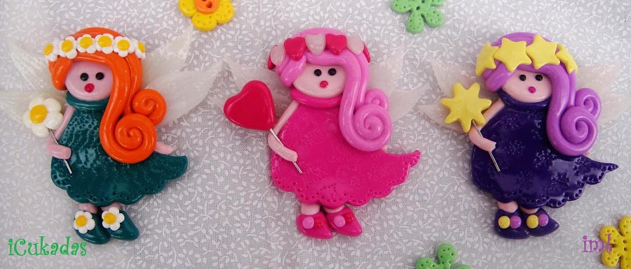 Que voy a decir, que me encantan!!!!! que tenía ganas de hacer hadas o duendes y cosas así, y esto es lo que salió. Son broches, de arcilla polimérica, para usarlas como un broche normal y corriente o para adornar la mochila del cole, un estuche, un bolso o lo que sea, en este caso no miré la utilidad, solo lo monas que son ;)