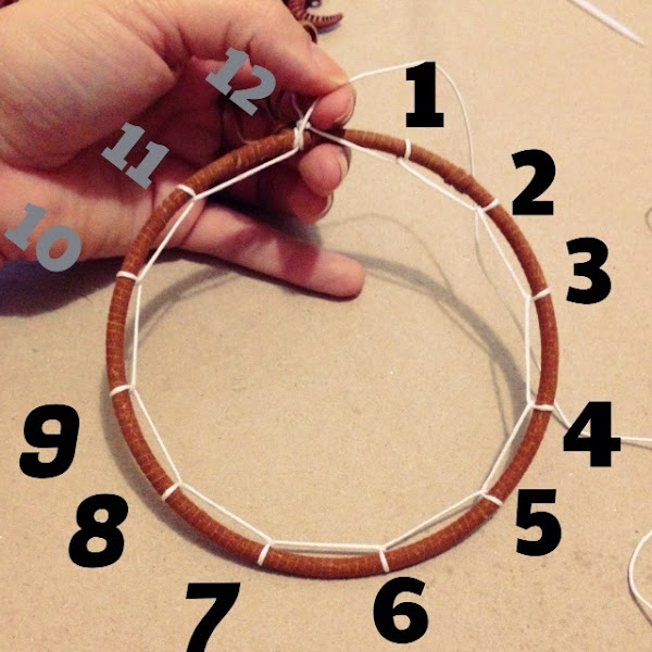 Ya forrado el aro vamos a empezar a hacer el tejido del centro, vamos a hacer 12 puntos, como que fuera un reloj, empezamos en el 12, amarramos el hilo luego seguimos hacia la derecha, pasamos el hilo hacia atrás y damos la vuelta regresando hacia adelante pero pasando por el centro de la argollita que vamos formando, así repetimos, el hilo hacia atrás, luego regresamos al frente por la parte de adentro del centro y así sucesivamente con los 12 puntos.