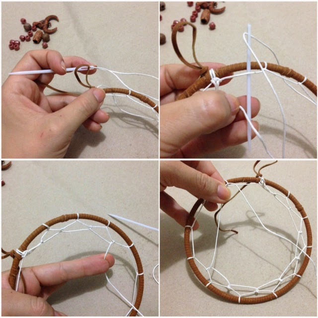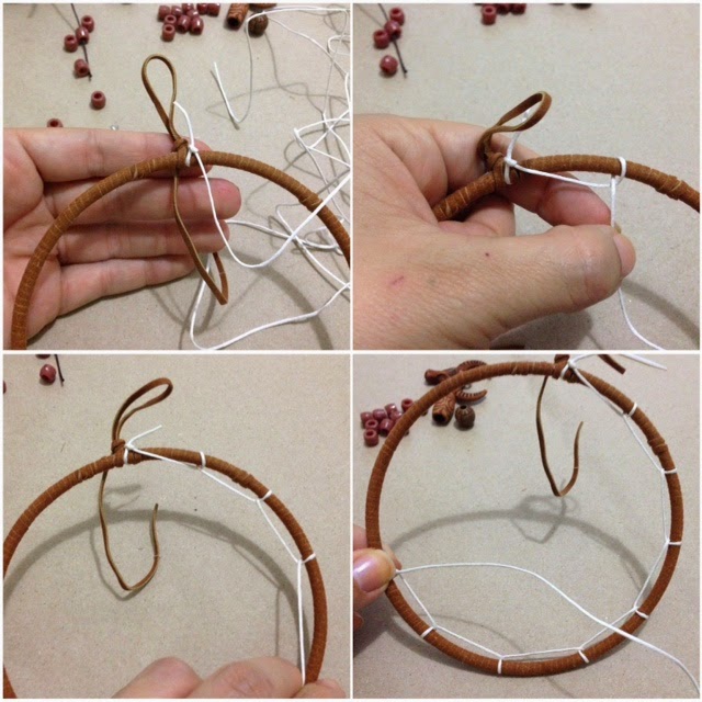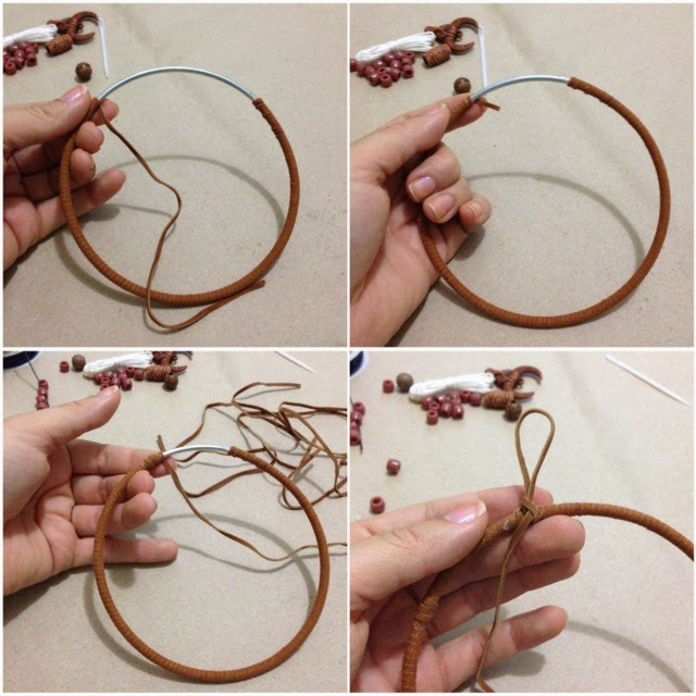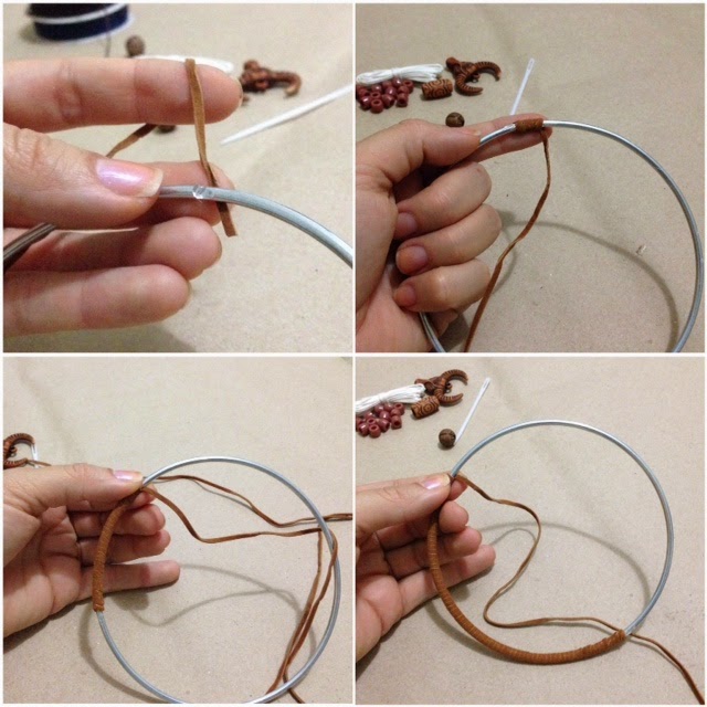 Tomamos el aro y empezamos a forrarlo con la tira de cuerito, le ponemos una gota de silicón al inicio y lo enrollamos hasta finalizar, antes de terminar hacemos un par de nudos y dejamos una orejita del cuerito arriba para que podamos colgarlo después.