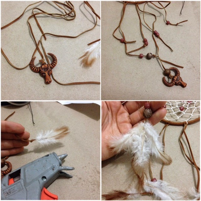 Ahora metemos las cuentas y le hacemos un nudo, dejamos un pedacito para luego poder pegar las plumas, en mi caso he pegado 3 plumas en cada punta, para que se vea más abundante y decorado, recuerden entre más dijes, mejor se va a ver y las plumas son indispensables.