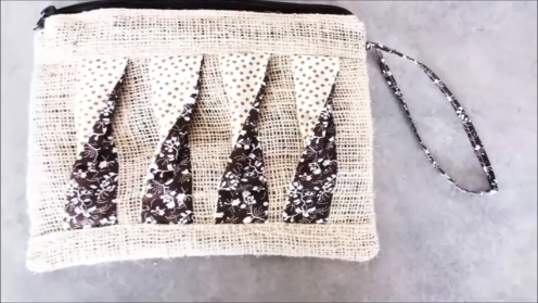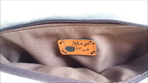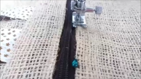 Y ya la pieza delantera del bolso está terminada. Ahora vamos a poner la cremallera. Lo haremos por el lado del derecho de la pieza delantera y con el carro de la cremallera hacia abajo, y cosemos por el borde de esta forma:
