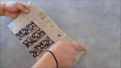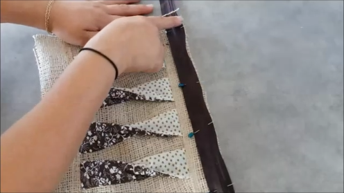 Ahora vamos a juntar las piezas de tela estampada, de manera que quede como un pliegue. Y vamos sujetando con alfileres para que no se muevan al momento de coser.