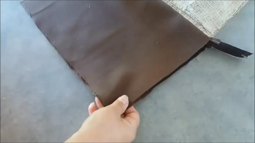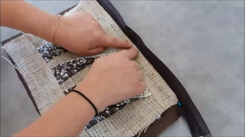 Hecho esto, colocamos encima de la pieza delantera del bolso, la otra pieza trasera de saco, alineándola con el borde de la cremallera, así: