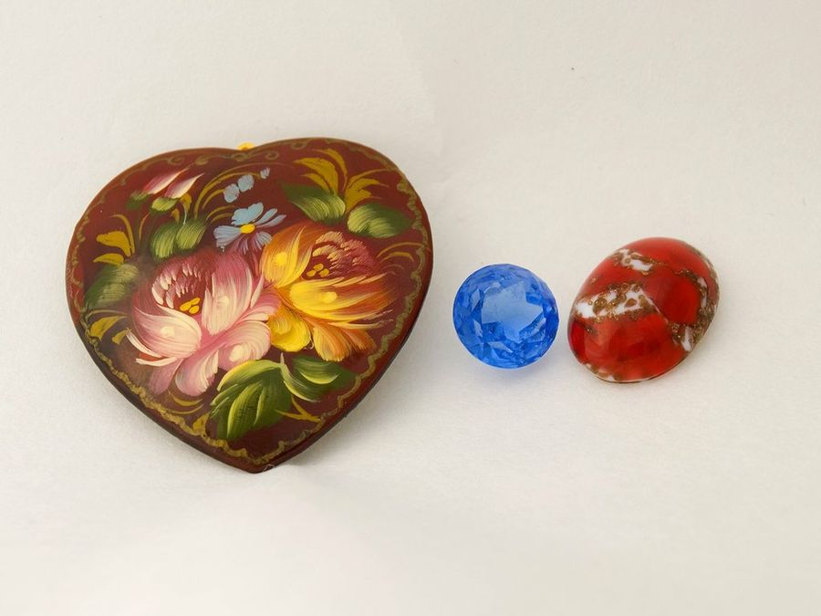 Aquí tenemos varias piezas que nos permiten apreciar el inconveniente. Las superficies curvas reflejan casi toda la habitación, y en cualquier posición ofrecerán reflejos molestos. Observemos la parte izquierda del colgante en forma de corazón, la piedra de color rojo, y la talla celeste. La suave luz de la ventana, tan adecuada para la infinidad de trabajos, arranca molestos brillos en los objetos pulidos y reflectantes.