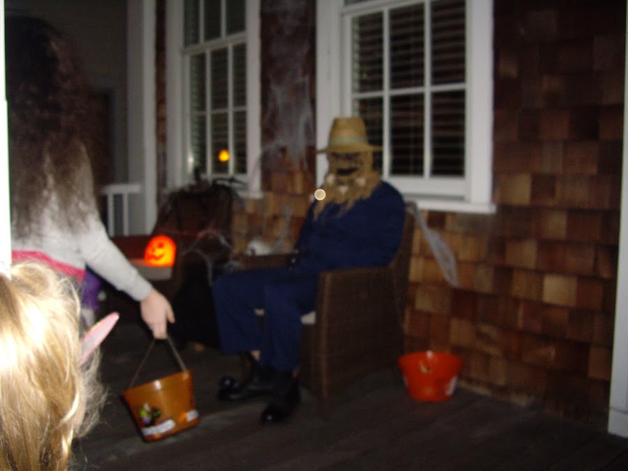 Cuando llegamos a esta casa, mis hijas tenian un poco de miedo, pero igual se acercaron. El espantapajaros estaba quieto como una estatua, ellas lo observaron por un buen rato, y el no se movia, cuando se animaron a tomar algunos caramelos, el se movio y pego un grito, mis hijas se asustaron, pero igual les gusto y se divirtieron, jajajaaaa!!!!!!!!!