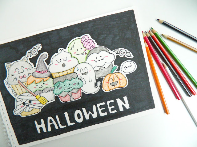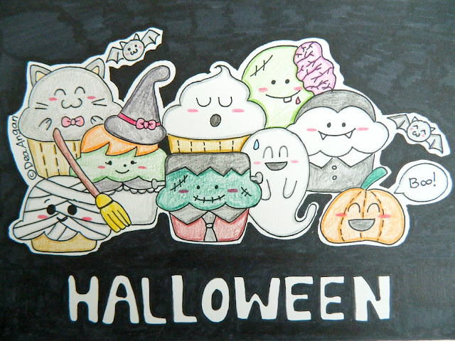 De todos modos, estoy interesado actualmente en doodles (garabatos) y los Kawaii, así que hice mi primer doodle. Esto es un doodle de Halloween que hice para Halloween. No es perfecta, pero estoy orgullosa de mí misma para crear monstruos lindos de Halloween. Son cupcakes de monstruos.
