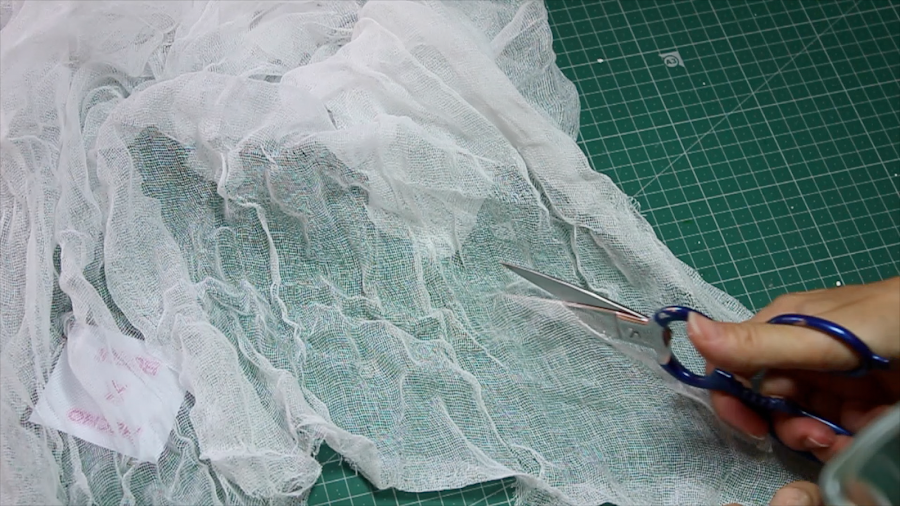 Con la gasa extendida le hago unos cortes en la parte de abajo y cuando estiro la gasa queda de esa forma, hecha jirones, desgarrado y deshilachada.