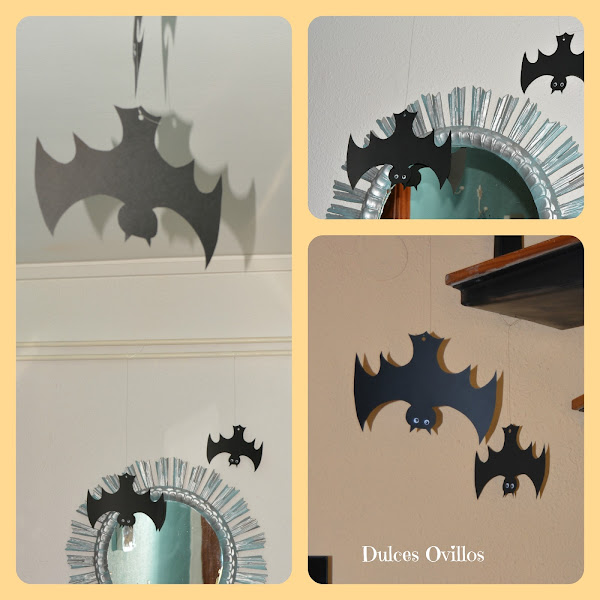 Los murciélagos son del Halloween pasado, si se guardan bien sirven para el siguiente año. Inclusive he utilizado el mismo hilo de pescar. Me he encontrado uno tuerto pero le he vuelto a pegar el ojo y listo. La idea la encontré en Pinterest. Verás que están colgados de un arbolito y por eso están hechos con goma-eva pero para dentro de casa con cartulina hacen la función. Eso ya al gusto de cada cual. La plantilla la saqué de la página HGTV . Encontrarás el link de enlace para bajártela entre la lista de materiales.