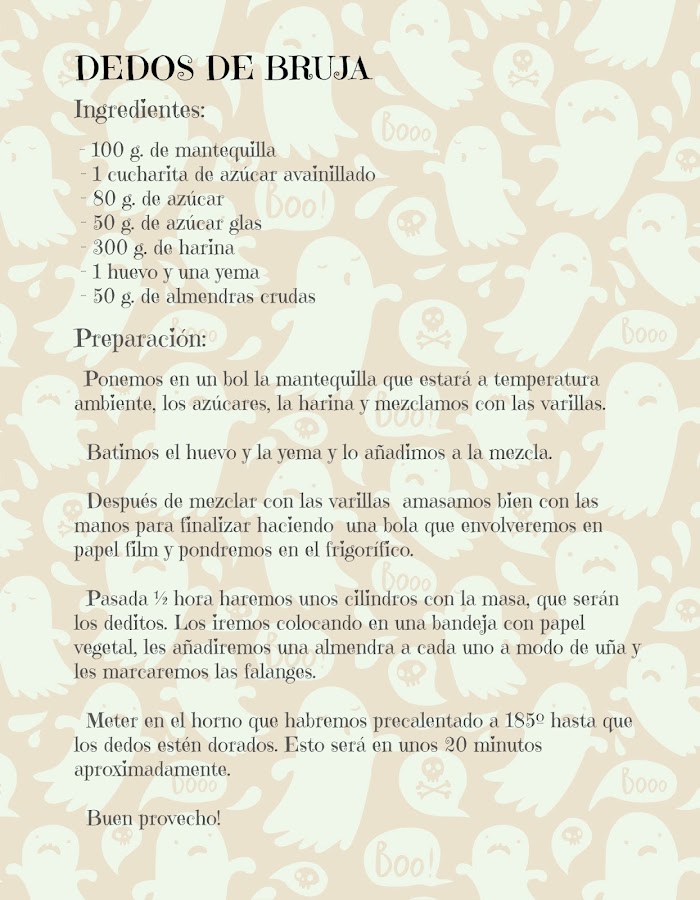 Otra cosa que no perdonan nunca por estas fechas en casa son los dedos de bruja. Al final del post encontrarás la receta. Son unas galletitas cilíndricas, que al llevar en su extremo una almendra adoptan una forma de dedo con uñas largas.