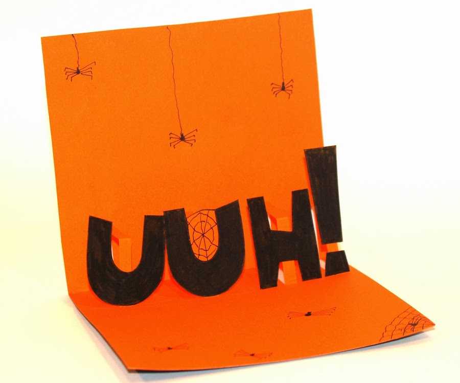 * Decora la tarjeta con arañitas y telas de araña. Pinta las letras de negro con el marcador.