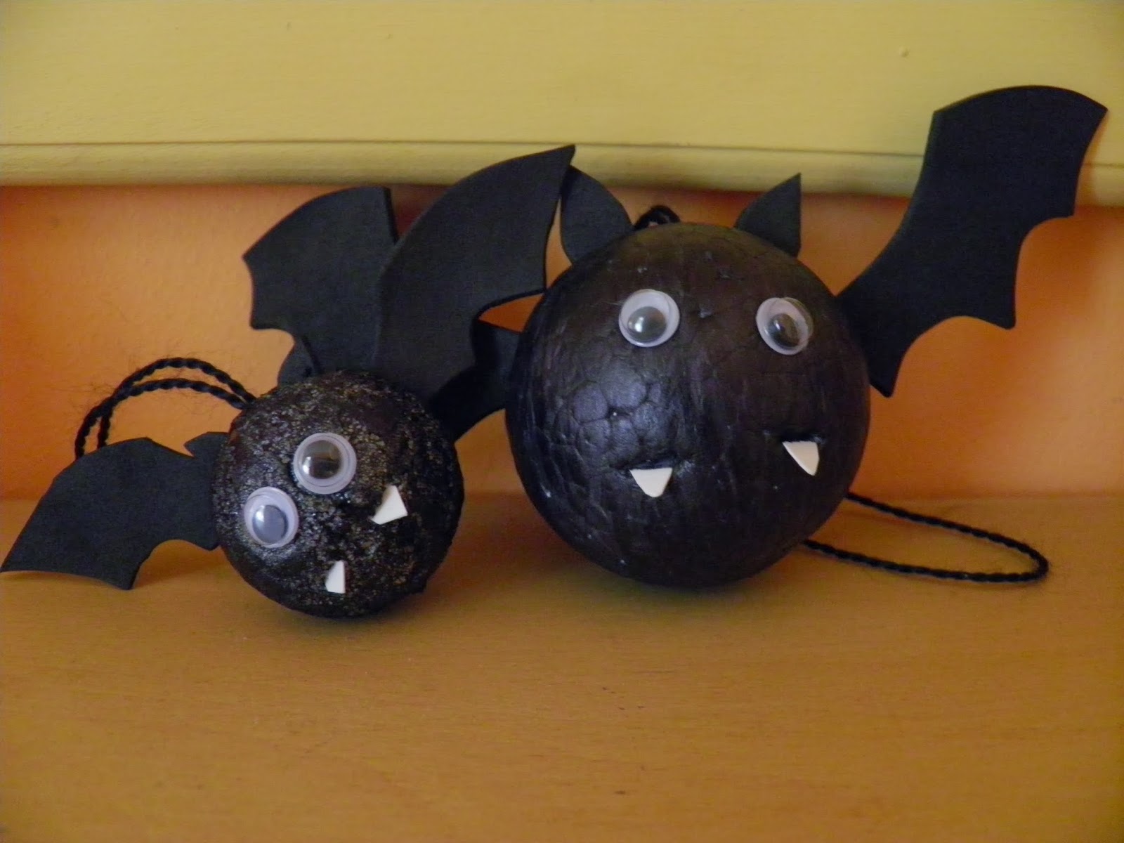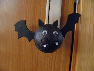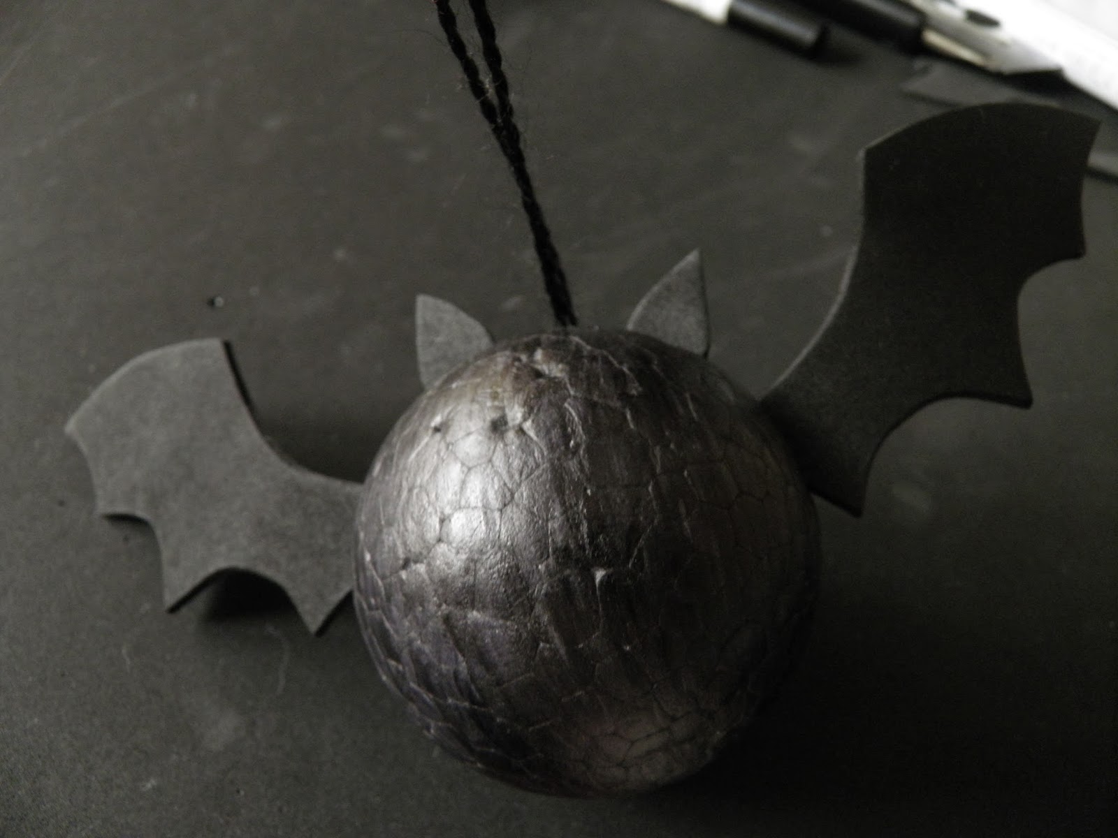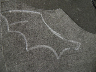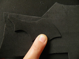 Ahora, en la goma eva dibujamos un ala de murciélago, dejando un poco de margen en el lado que va a ir unido a la bola. La recortamos y la usamos de molde para hacer otra, así nos aseguramos de que nos queden iguales en tamaño.