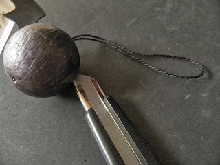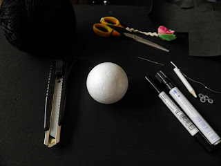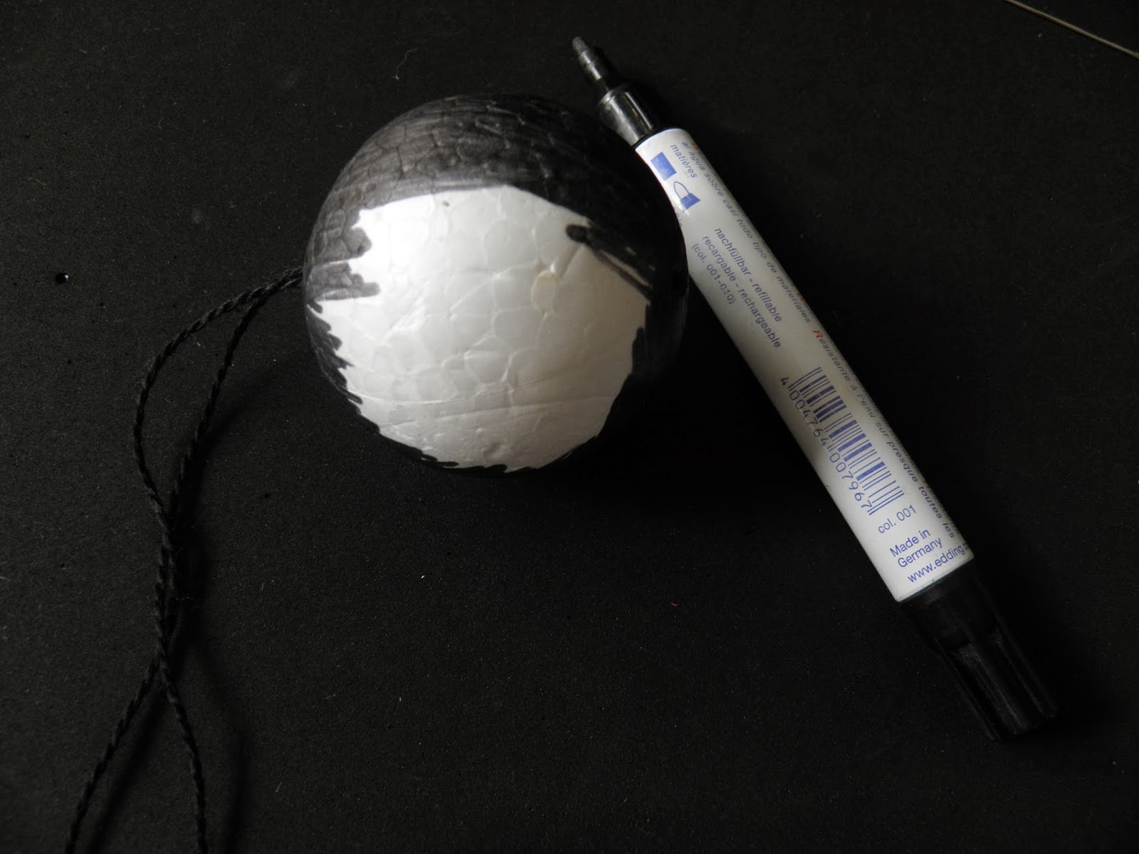 A continuación pintamos la bola, o bién con el rotulador permanente o con la laca de uñas. Hay que tener en cuenta que la laca de uñas se va a "comer" algo de la bola, dejandola con una textura porosa. Eso ya sería al gusto.