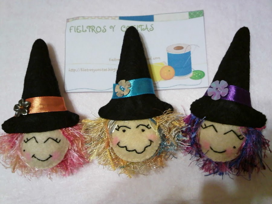 Sigo con la campaña de Halloween, hoy os traigo unos simpáticos Frankenstein de fieltro que no dan nada de miedito y unas caritas de brujas listas para volar en sus escobas.jejejej , la del medio se mareo un poquito en su primer vuelo jejejeej