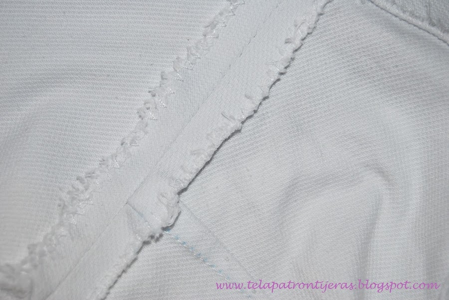 Iniciamos la confección cerrando las pinzas y unimos la parte delantera derecha con la espalda. Spbrehilamos las costuras. Dejamos el lado izquierdo sin unir, ya que es donde irán los botones de cierre, aunque sí sobrehilamos la tela.