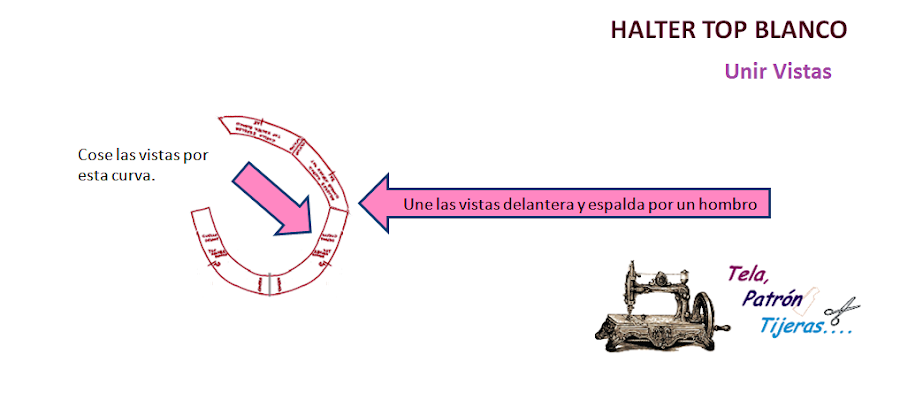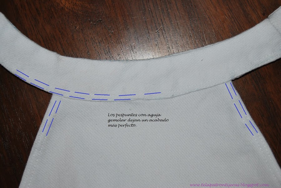 Unimos el cuello al delantero y espalda del top: prestando atención a colocar cada parte entre las dos marcas que están señaladas en el cuello y lo fijamos con un pespunte doble por todo el borde.