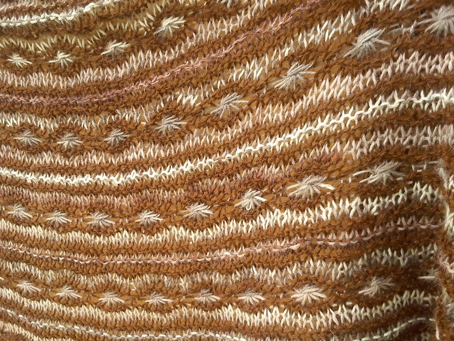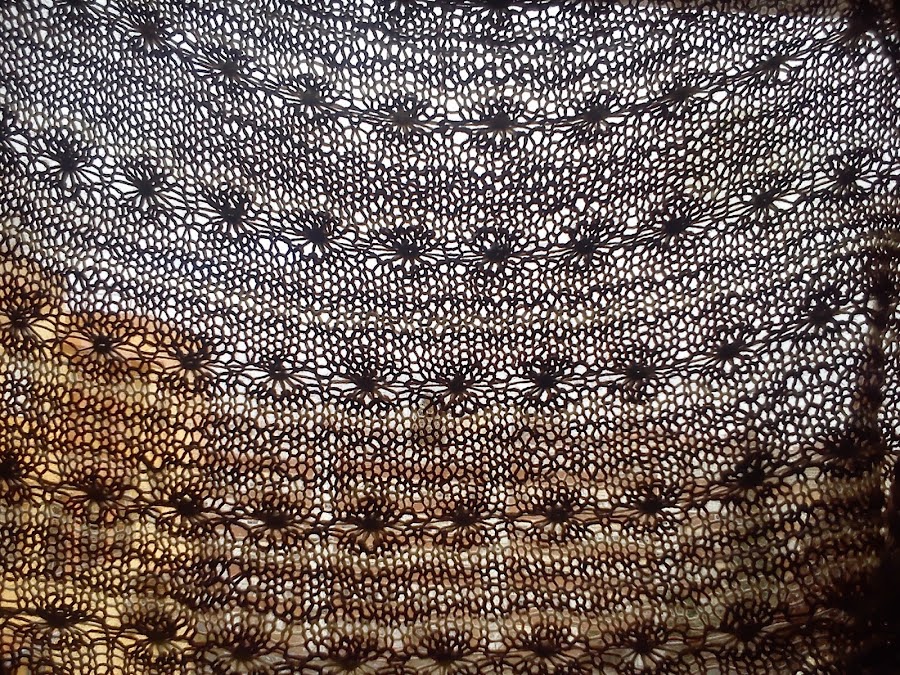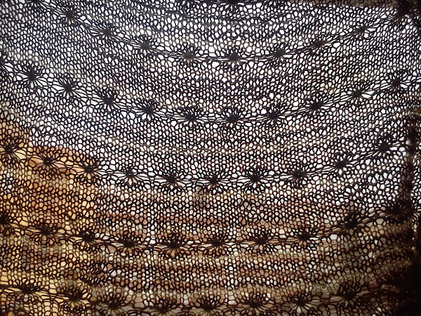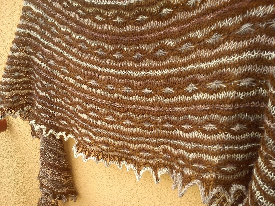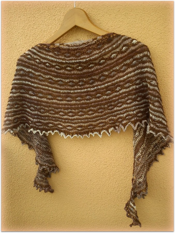 Sólo he necesitado dos madejas para hacer el chal: alpaca marrón y una de mezclilla. En cuatro días nada más y uno más para bloquearlo(porque si no es un churro) estaba terminado. Tiempo record y dolor supremos de brazo porque no era lo único que he hecho en esta semana, :)