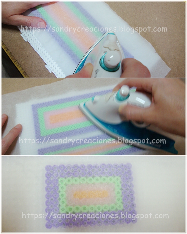 Paso 4. Planchar las piezas de Hama Beads. Una vez tenemos los patrones pasados a Hama Beads Midi pasamos a plancharlos por los dos lados. Para ello utilizamos un papel de horno del tamaño del patrón para ponerlo encima y planchamos a una temperatura media sobre el papel de horno sin olvidarnos de ir moviendo la plancha por toda la superficie de nuestro patrón. La temperatura de la plancha la podéis regular a vuestro gusto, cuanto más temperatura más rápido se fundirán los Hama Beads. Nosotros preferimos utilizar una temperatura media aunque eso signifique ir más lentos.