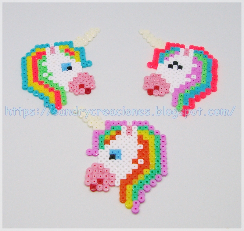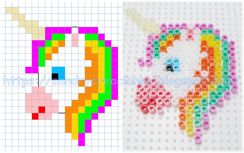 Paso 7. Decorar el estuche (opcional). Para decorar el estuche decidimos hacer tres unicornios en Hama Beads Mini. Para ello creamos y pasamos a la placa de Hama Beads Mini tres modelos de unicornios que podéis ver a continuación: