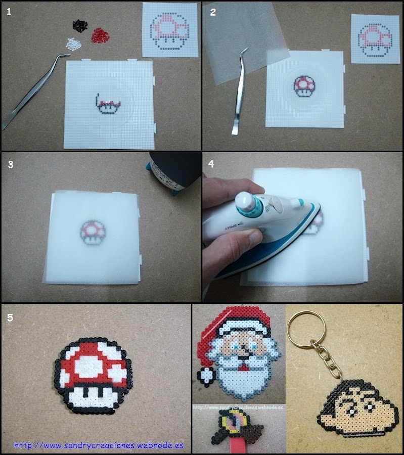A grandes rasgos, se compone el dibujo o motivo que queramos hacer con Hama Beads encima de la placa de Hama Beads, una vez terminado, se pone el papel de horno encima y se aplica calor con la plancha, moviéndola continuamente por toda la superficie del motivo para que se vayan fundiendo los tubos de Hama Beads y se unan entre ellos, quedando así todo bien unido. Las figuras o motivos resultantes pueden servir para múltiples cosas, desde simplemente decorativos, a poder hacer llaveros, puntos para libros, huchas, cuadros, etc... (imagen 2)