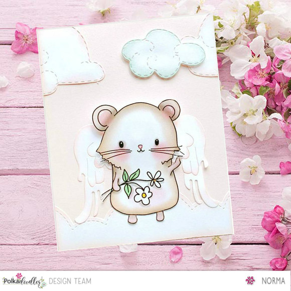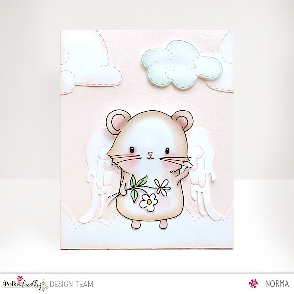 Thats the reason of my card this week, You already know how much I love this digi,Too cute Hamster love, this time, I put some wings and floffy clouds (is a super cute dies from Polkadoodles too) and I will give the card for my little friend, so she can feel a little better.