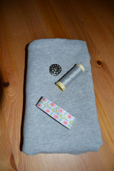 He utilizado tela de camiseta gris de CAL JOAN y una cinta al bies floreada, para los remates del cuello y el bajo del vestido...