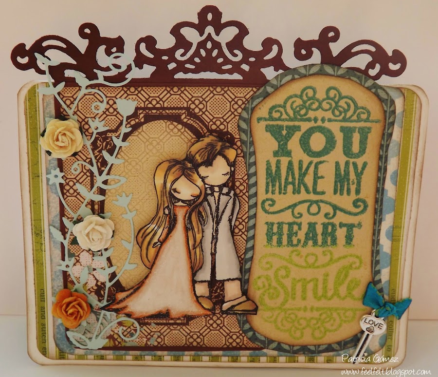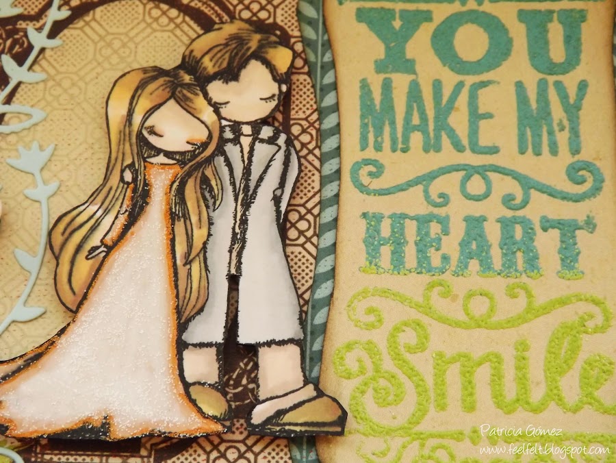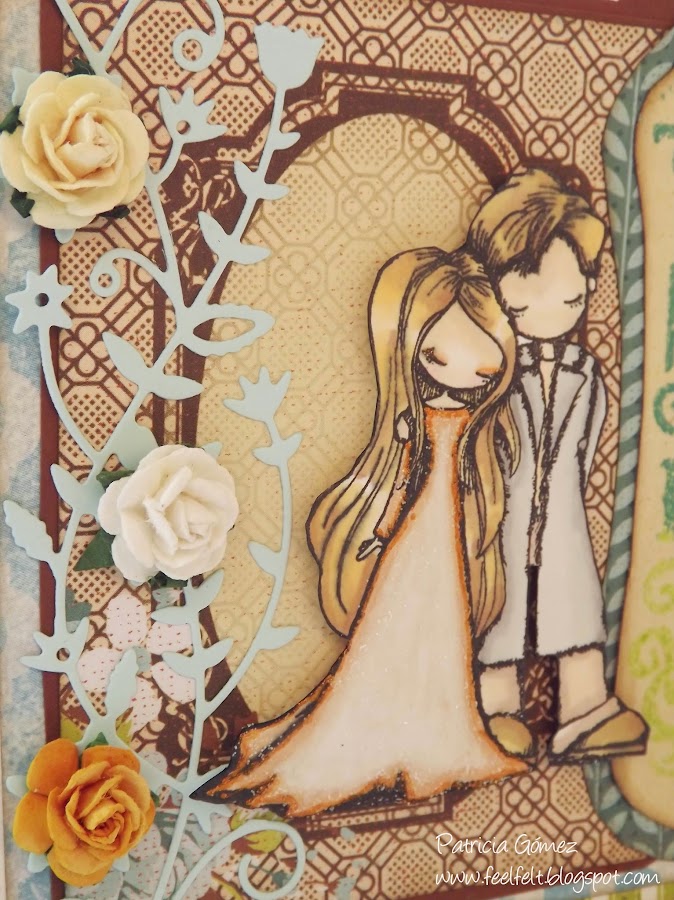 Aproveché una parejita de novios que ya tenía coloreada, y opté por elaborar una tarjeta para boda, que bien podría valer como invitación, o bien, para regalar algún dinerito y felicitar por el enlace.
