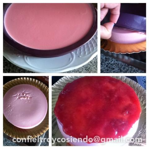 Una vez fría la desmoldamos y cubrimos con la mermelada. Un truco para extenderla mejor es llevarla unos segundos al microondas y removerla con una cuchara vigorosamente para que se extienda mejor. Como veis al desmoldar me ha quedado un poco fea, pero como lleva la mermelada encima no pasa nada.