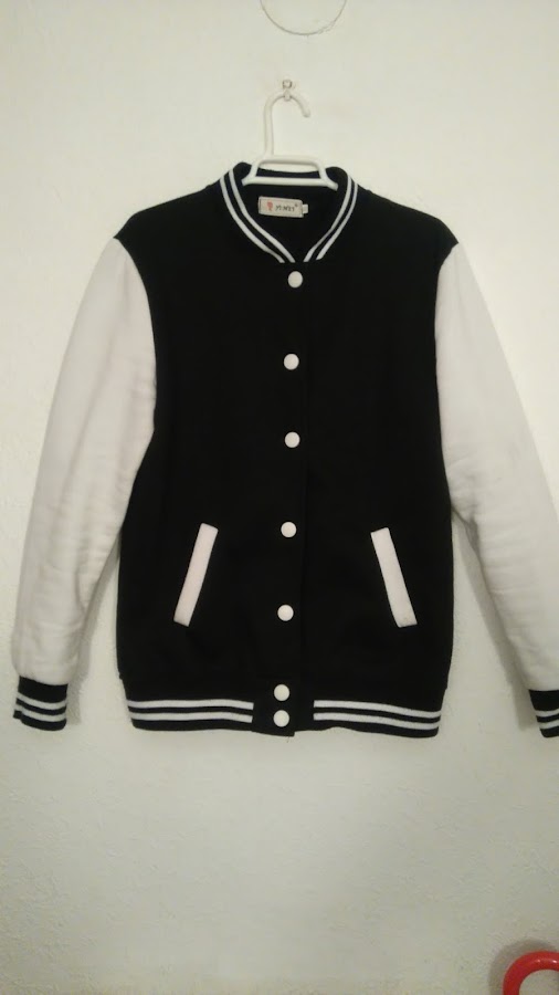 Es de tela de sudadera, con botones de corchete. La hay en varios colores (rojo, verde botella, rosa, naranja...) y está genial!