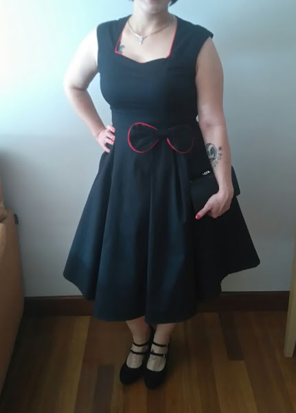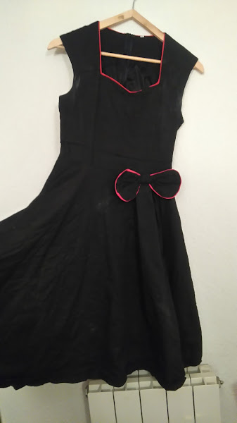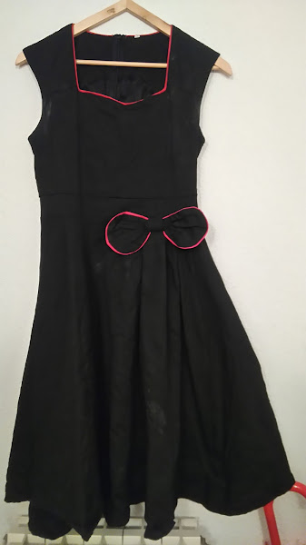 La tela es elástica, gruesita y nada transparente. Está genial. Sin mangas, con un escote muy bonito, queda ajustado hasta la cintura, y la falda tiene mucho vuelo. Lo más importante es que es comodísimo. La verdad es que la tela es de buena calidad y esta bien terminado. Me costó 19,91€, y creo que por ese precio está muy muy bien. Os enseño como queda puesto, o mejor dicho, como me queda a mi, Yo me cogí una XL, fiándome de la tabla me medidas, y creo que una talla menos también me podría haber ido bien porque es elástico, pero preferí tirar a lo grande, que siempre tiene arreglo. No me aprieta nada y es muy cómodo. Creo que tenían una talla más también.